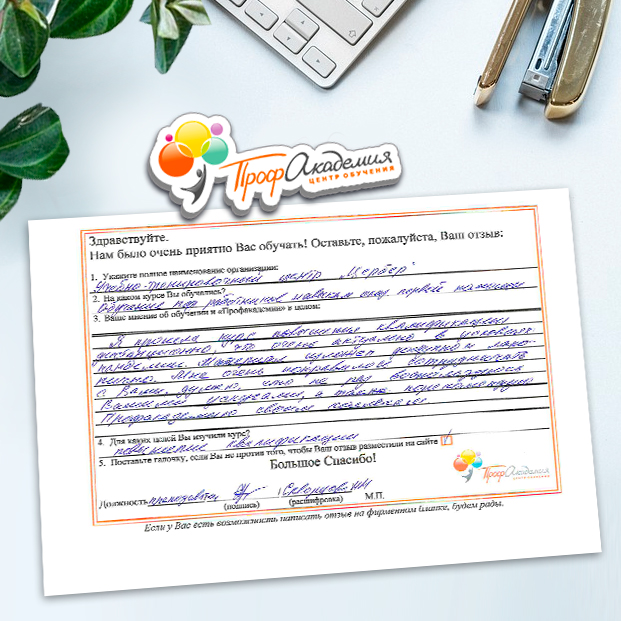 Хочется выразить огромную благодарность ООО "Профессиональная академия" за предоставления образовательной услуги. Особое спасибо специалисту по работе с клиентами Аликбаеву Николаю Ураловичу. Приятно было работать с хорошо знающим свое дело специалистом.